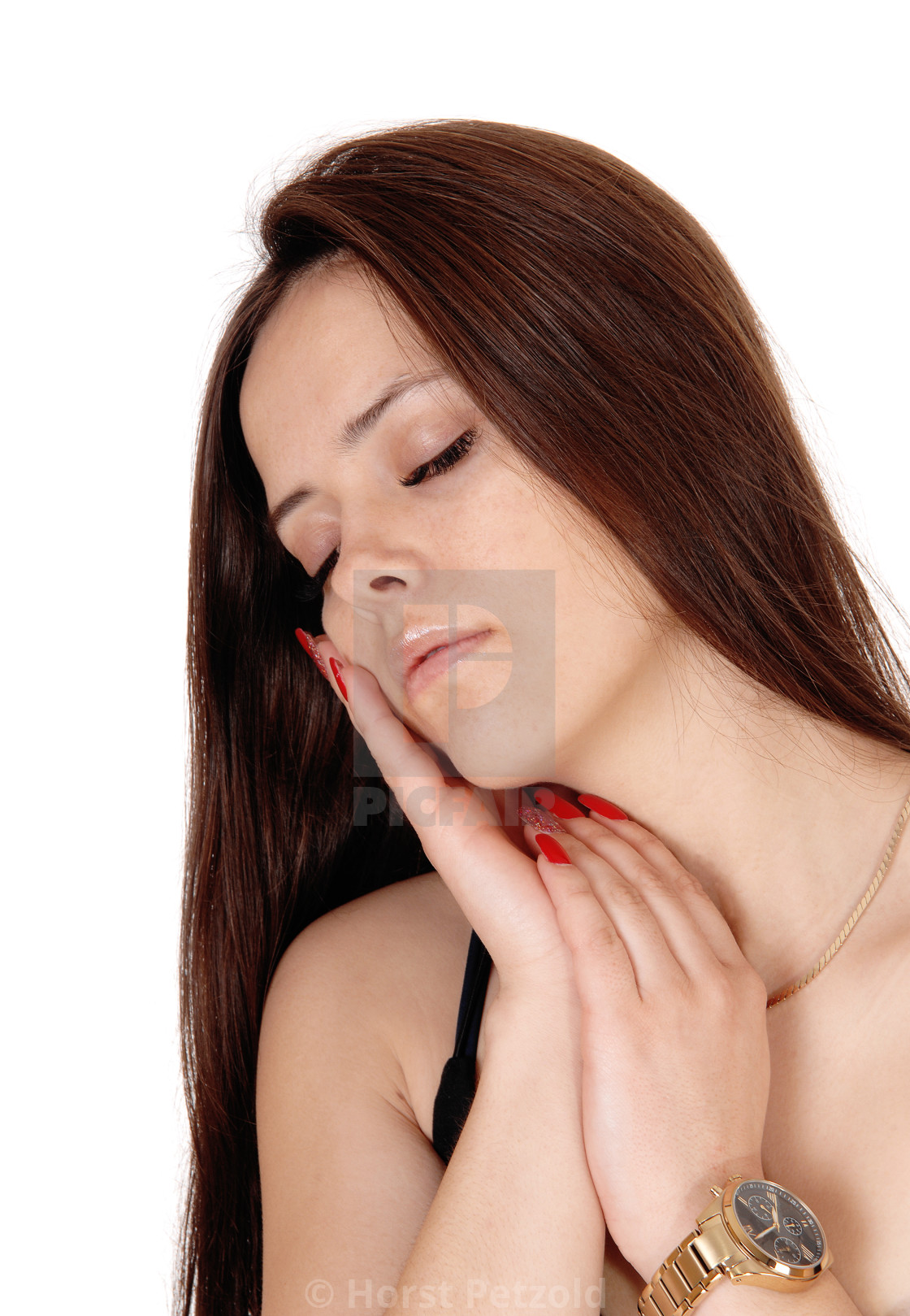 Pretty Woman Standing With Her Hands On Her Face Sleeping License Download Or Print For 9 92 Photos Picfair