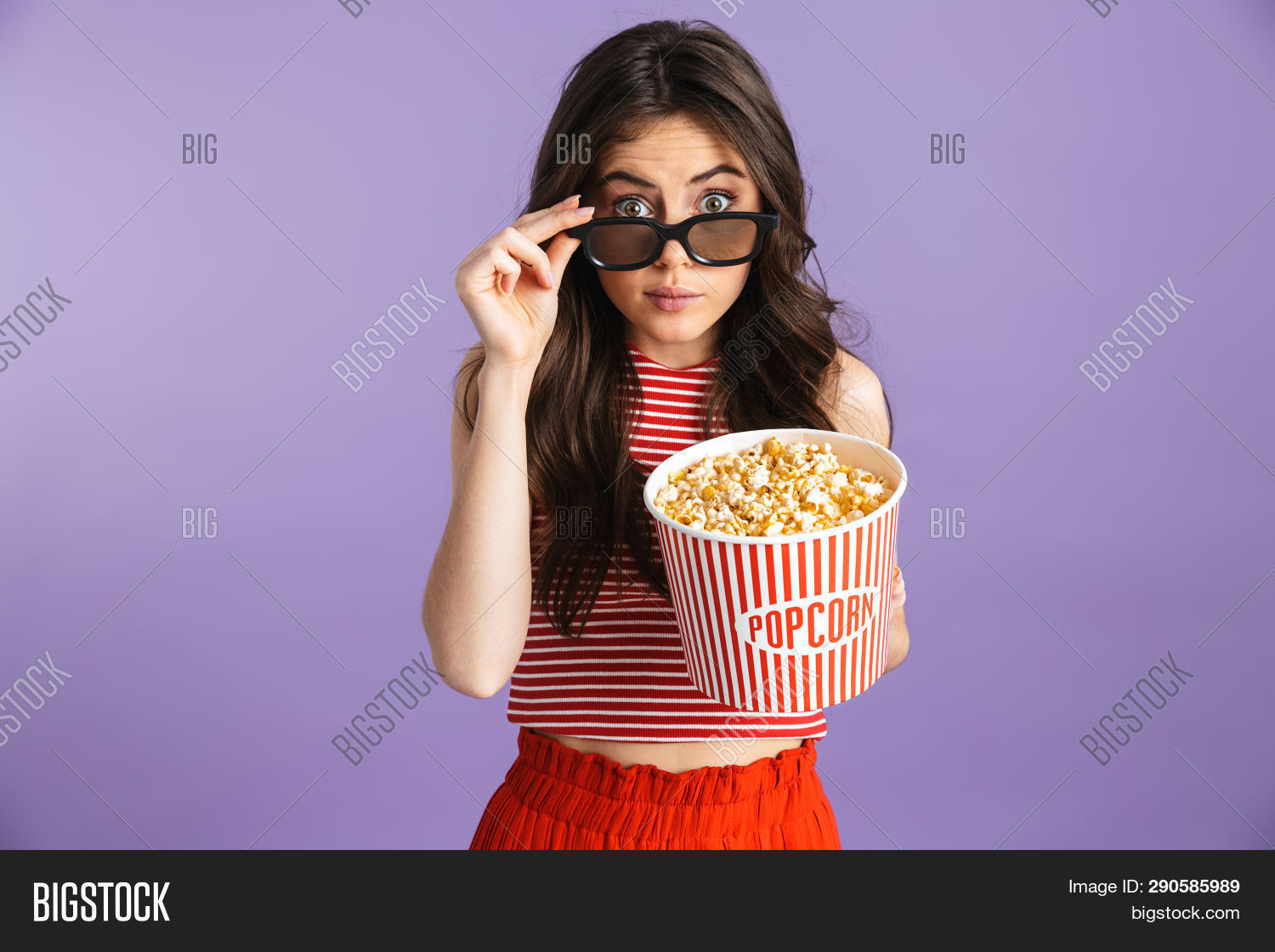 Pretty Woman Is Smiling Pretty Female Has Quarantine Free Time Watch Movie Impressed Surprised Unexpected Film Movie Ending Hold Big Pop Corn Box Si Stock Photo Alamy
